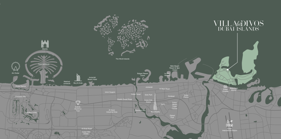 Villa del DIVOS is ideally positioned within the picturesque Dubai Islands, a luxurious retreat that combines coastal tranquillity with the pulse of urban life. Located just off the coast of Deira, it provides a serene escape from the city's hustle while remaining conveniently close to Dubai's vibrant lifestyle hubs.